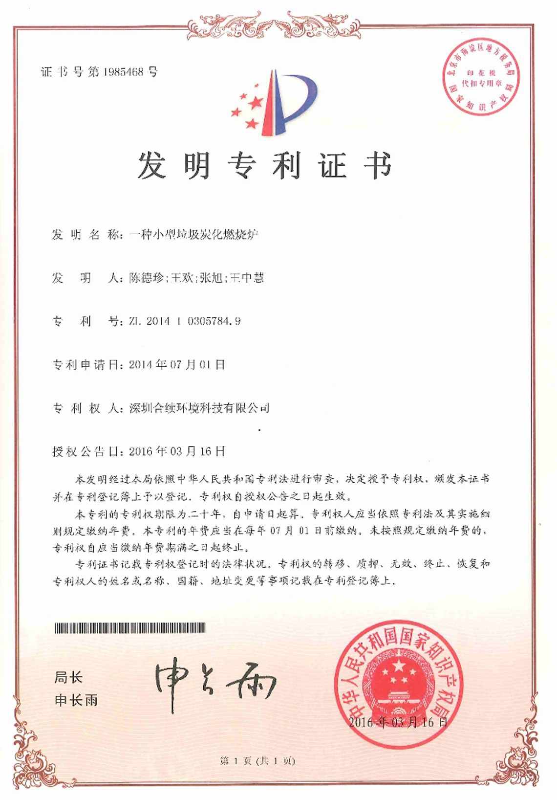 發明專利 一種小型垃圾炭化燃燒爐專利證書