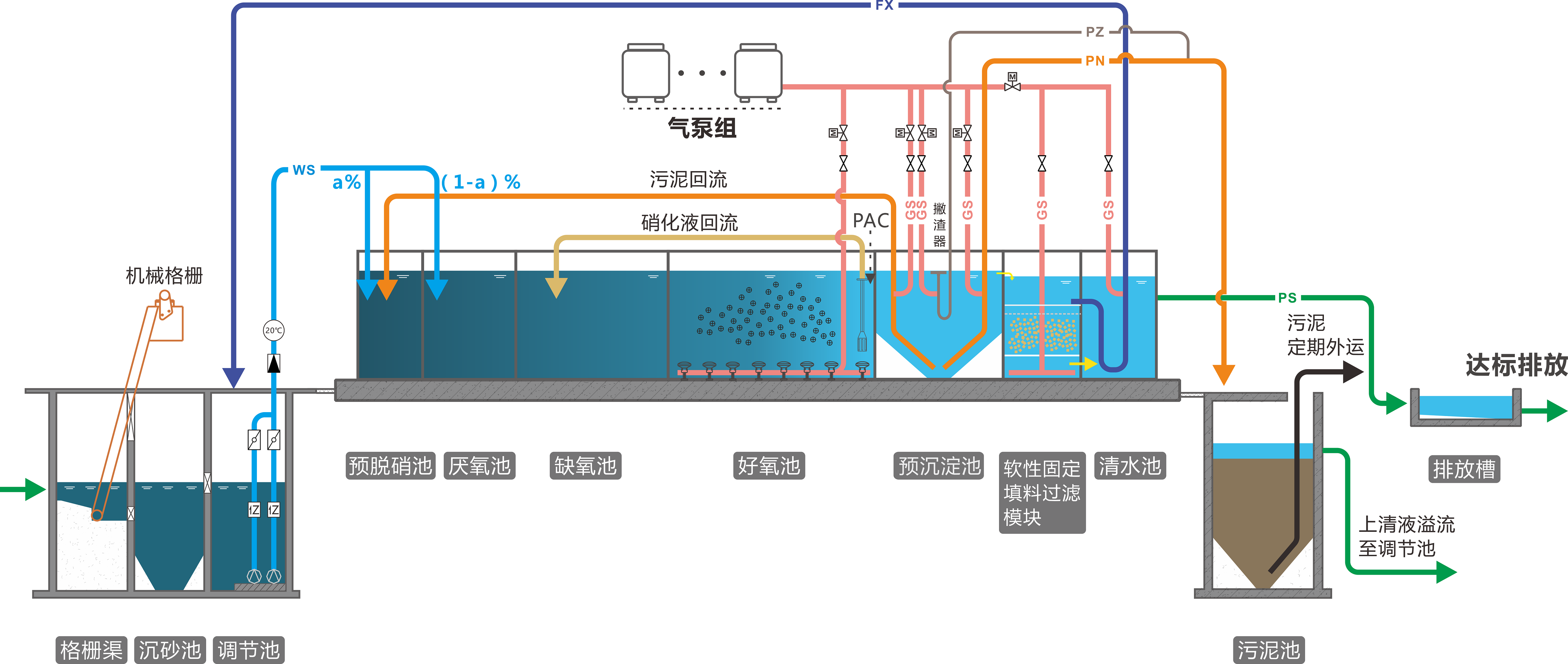 貝斯III采用A3/O-MBBR技術,結合生物量遞增APG填料,集活性污泥法和生物膜法的優勢于一體,配置軟性固定填料過濾新技術,全系列產品噸水運行能耗小于0.35 kW·h,出水指標穩定達到《城鎮污水處理廠污染物排放標準》(GB18918-2002)一級A標準。
