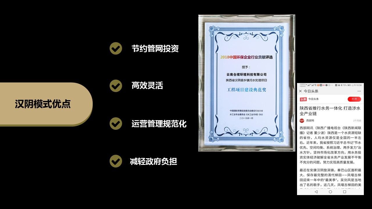 2017年底,地方國(guó)資企業(yè)陜西水務(wù)集團(tuán)下屬污水公司,承接了漢陰全縣的污水治理任務(wù),并經(jīng)過嚴(yán)格的篩選和考察,選擇了合續(xù)環(huán)境集團(tuán)作為其戰(zhàn)略合作伙伴。并從共贏發(fā)展為共生模式,2019年4月10日,云南合續(xù)環(huán)境科技有限公司與陜西省水務(wù)集團(tuán)污水處理有限公司在陜西省西安市合資成立陜西水務(wù)合續(xù)環(huán)境設(shè)備有限公司。