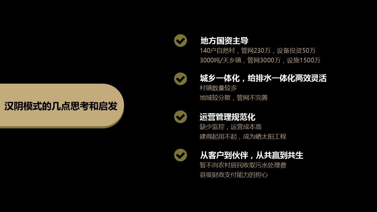 二、在利用國(guó)資企業(yè)的基礎(chǔ)上,發(fā)揮市場(chǎng)運(yùn)作、企業(yè)管理運(yùn)營(yíng)規(guī)范化的優(yōu)勢(shì)。漢陰模式實(shí)施縣城、鄉(xiāng)鎮(zhèn)污水一體化系統(tǒng)處理,全面有效地推進(jìn)了縣區(qū)水生態(tài)環(huán)境的綜合治理;統(tǒng)一運(yùn)營(yíng)模式、統(tǒng)籌調(diào)配人員,發(fā)揮技術(shù)優(yōu)勢(shì),集中節(jié)能降耗,實(shí)現(xiàn)高效運(yùn)轉(zhuǎn),解決鄉(xiāng)鎮(zhèn)收入低的問題。