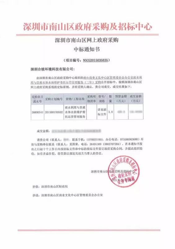 2015年10月20日,深圳合續環境科技有限公司收到了深圳市南山區政府發出的“中標通知書”,通知中標南山商業文化中心區管理委員會辦公室“雨水利用與景觀水體水質維護委托運營管理服務”(三年)。收到中標通知書后,我司即刻與管委會聯系洽談具體工作,并與原維護方進入交接程序。