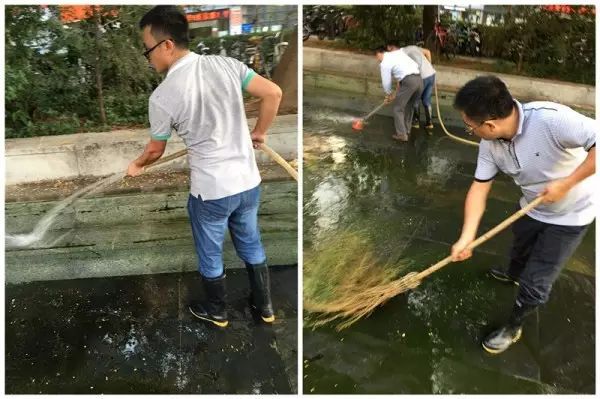 水池里面很多殘留的樹枝,需要獨自清理進垃圾袋,同事們正齊心協力地把這些樹枝中的“頑固派”清理掉。