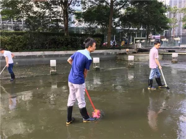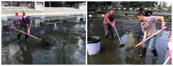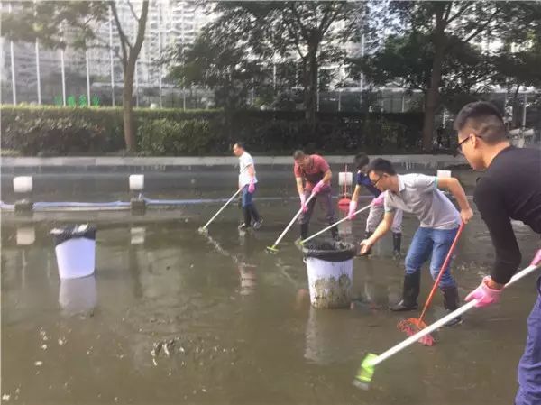 因本次水池整體清潔任務急、處理面積大、清潔人員短缺,2015年10月28、29兩日,在公司領導帶領下,辦公室、人事部的緊急組織下,深圳合續20余名男員工參與了“景觀水場地清潔工作”。