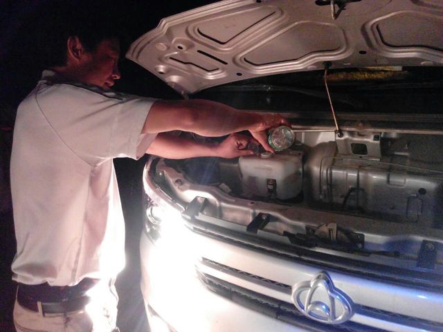 一位村民經(jīng)過時,駕駛的車輛缺水,便取了處理后的清水加入汽車水箱中