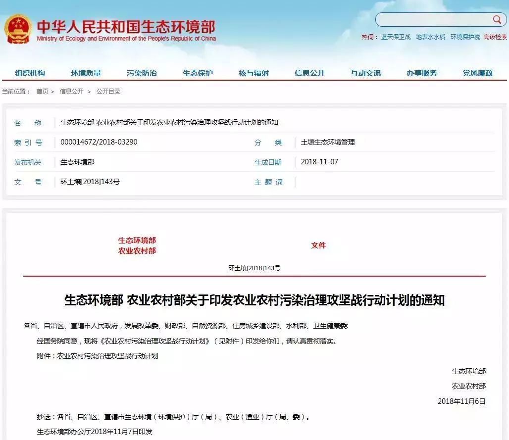 經國務院同意,生態環境部、農業農村部日前聯合印發《農業農村污染治理攻堅戰行動計劃》(以下簡稱《行動計劃》),明確了農業農村污染治理的總體要求、行動目標、主要任務和保障措施,對農業農村污染治理攻堅戰作出部署。