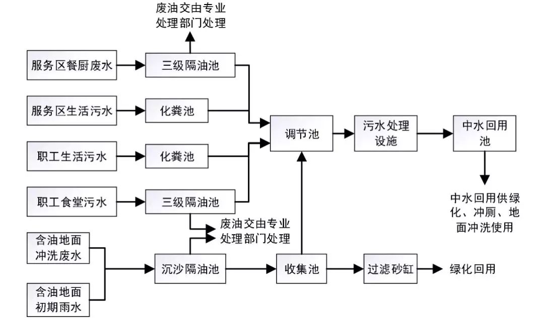 本次項目,在原有設施的基礎上進行改造,本著原有設施實現最大重復利用原則,增加一些必要的污水處理設施,使處理水能回收利用,供服務區沖廁及綠化使用。