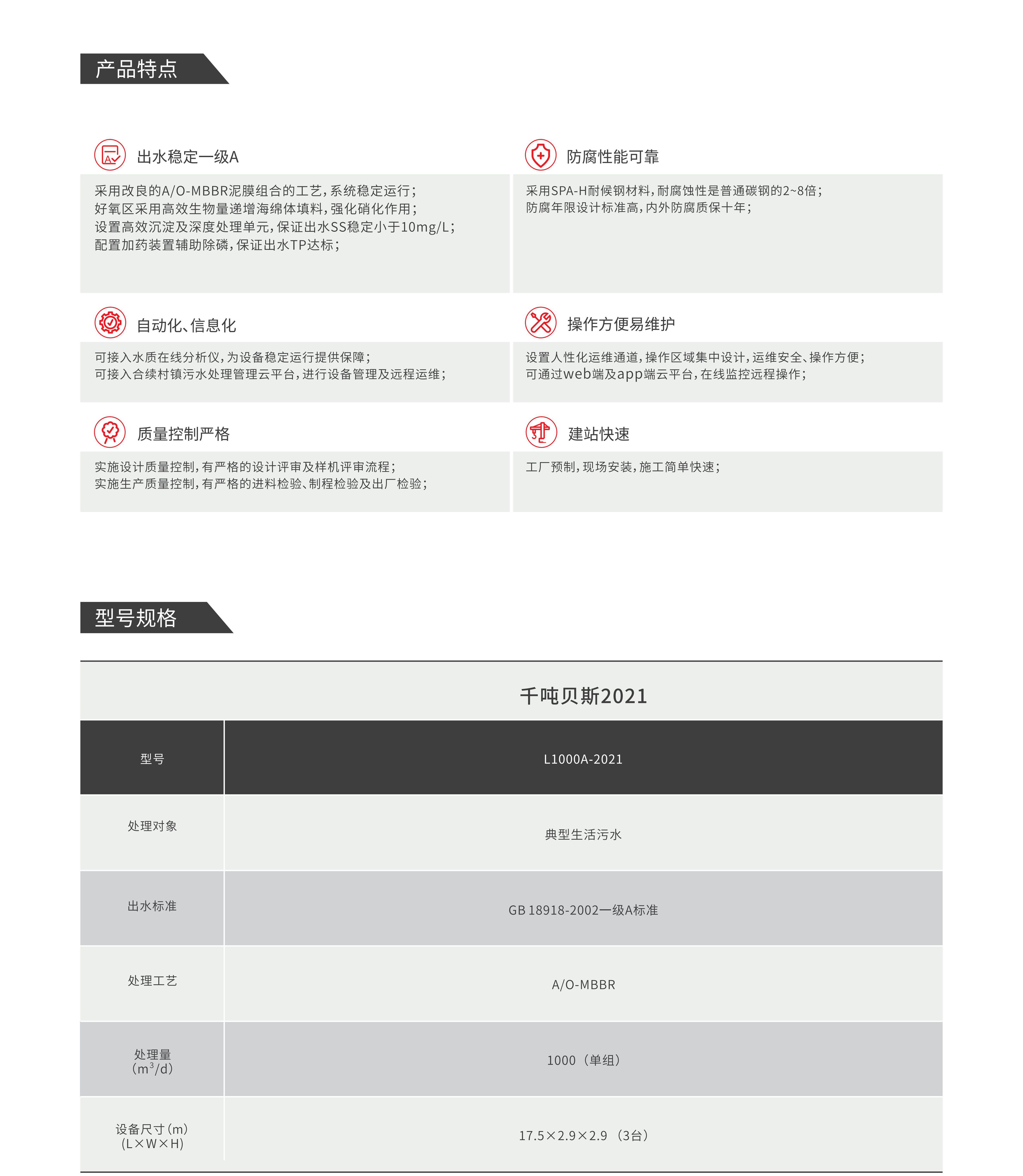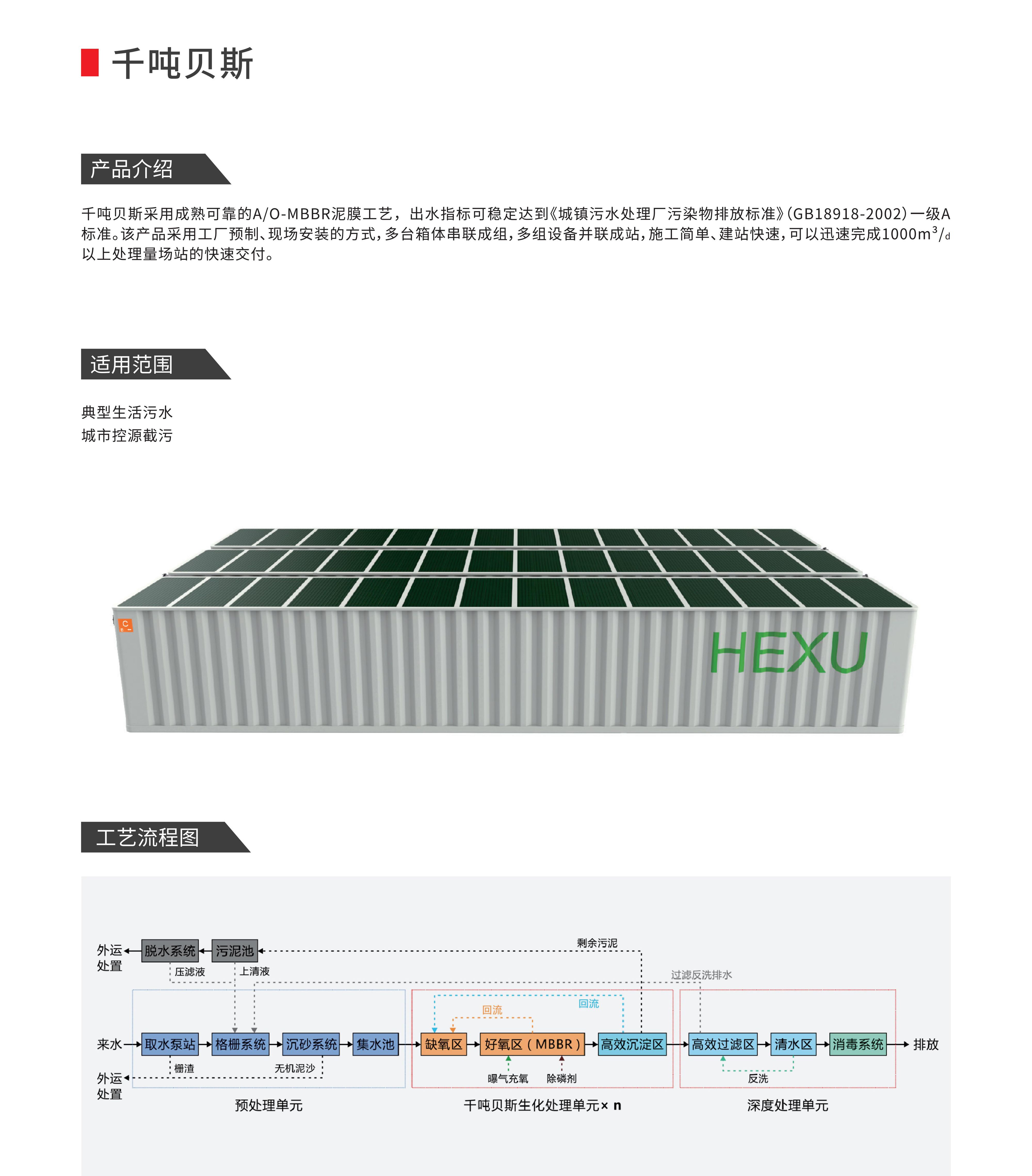 千噸貝斯采用成熟可靠的A/O-MBBR泥膜工藝,出水指標可穩定達到《城鎮污水處理廠污染物排放標準》(GB18918-2002)一級A標準。該產品采用工廠預制、現場安裝的方式,多臺箱體串聯成組,多組設備并聯成站,施工簡單、建站快速,可以迅速完成1000m3/d以上處理量場站的快速交付。