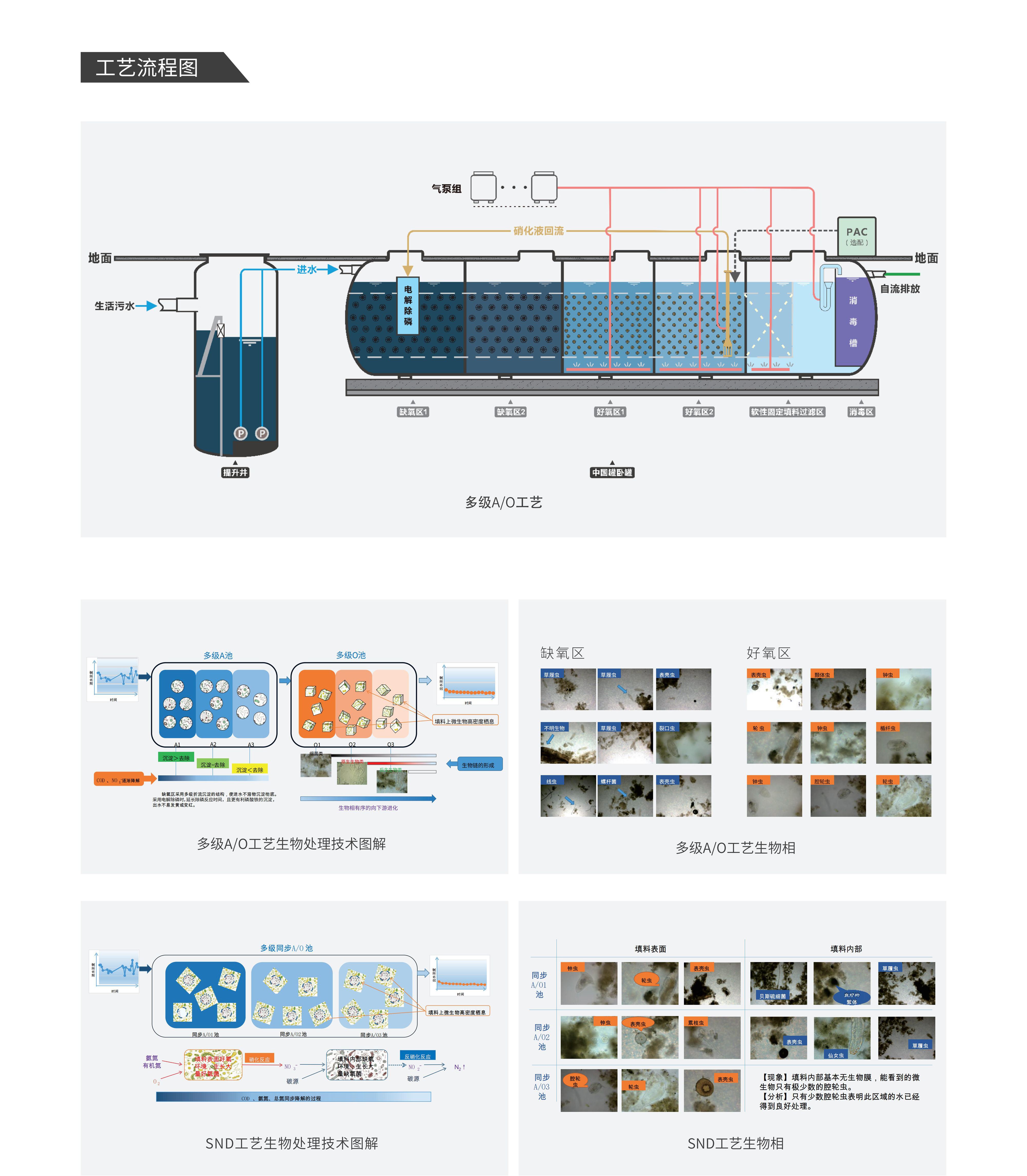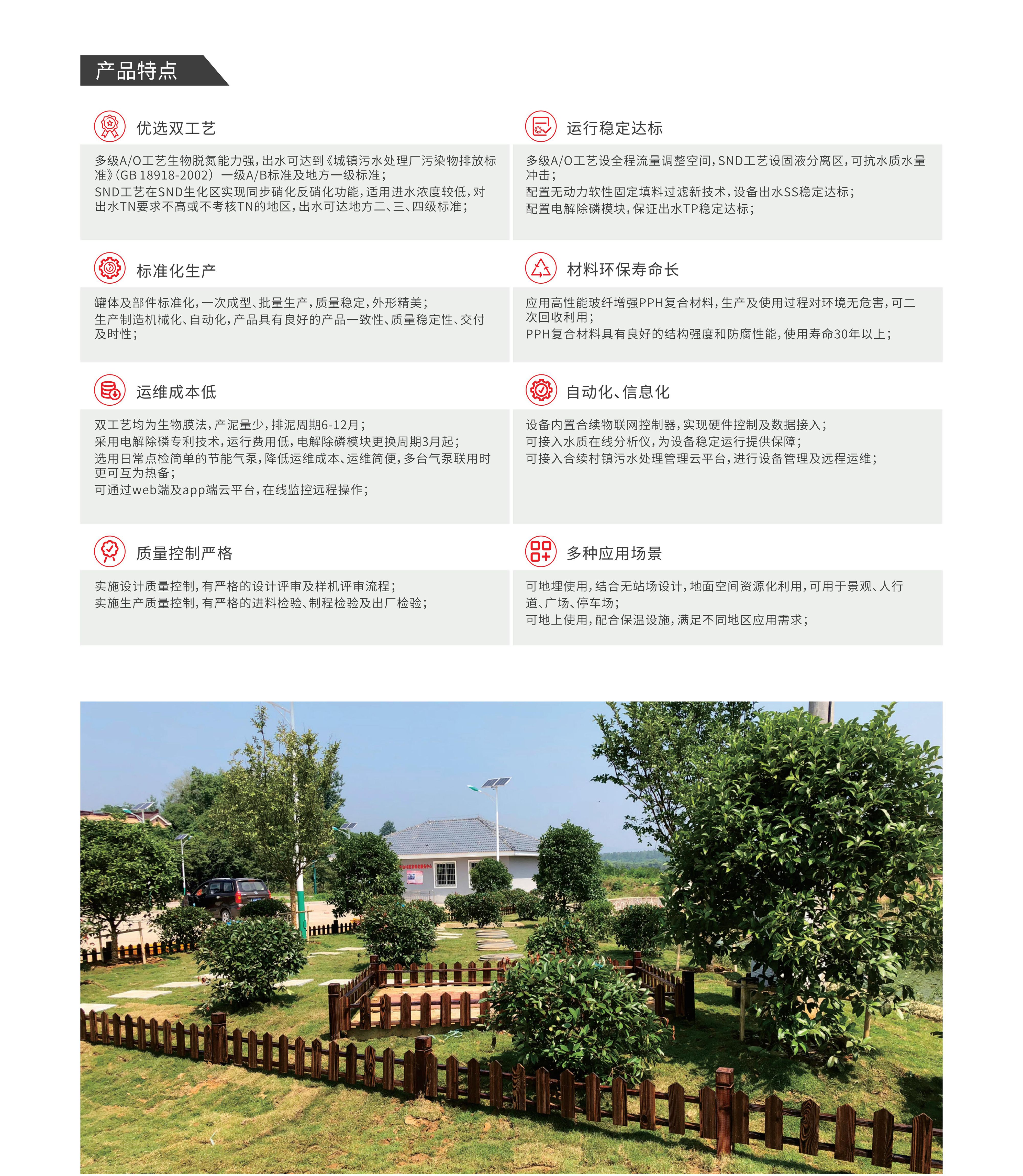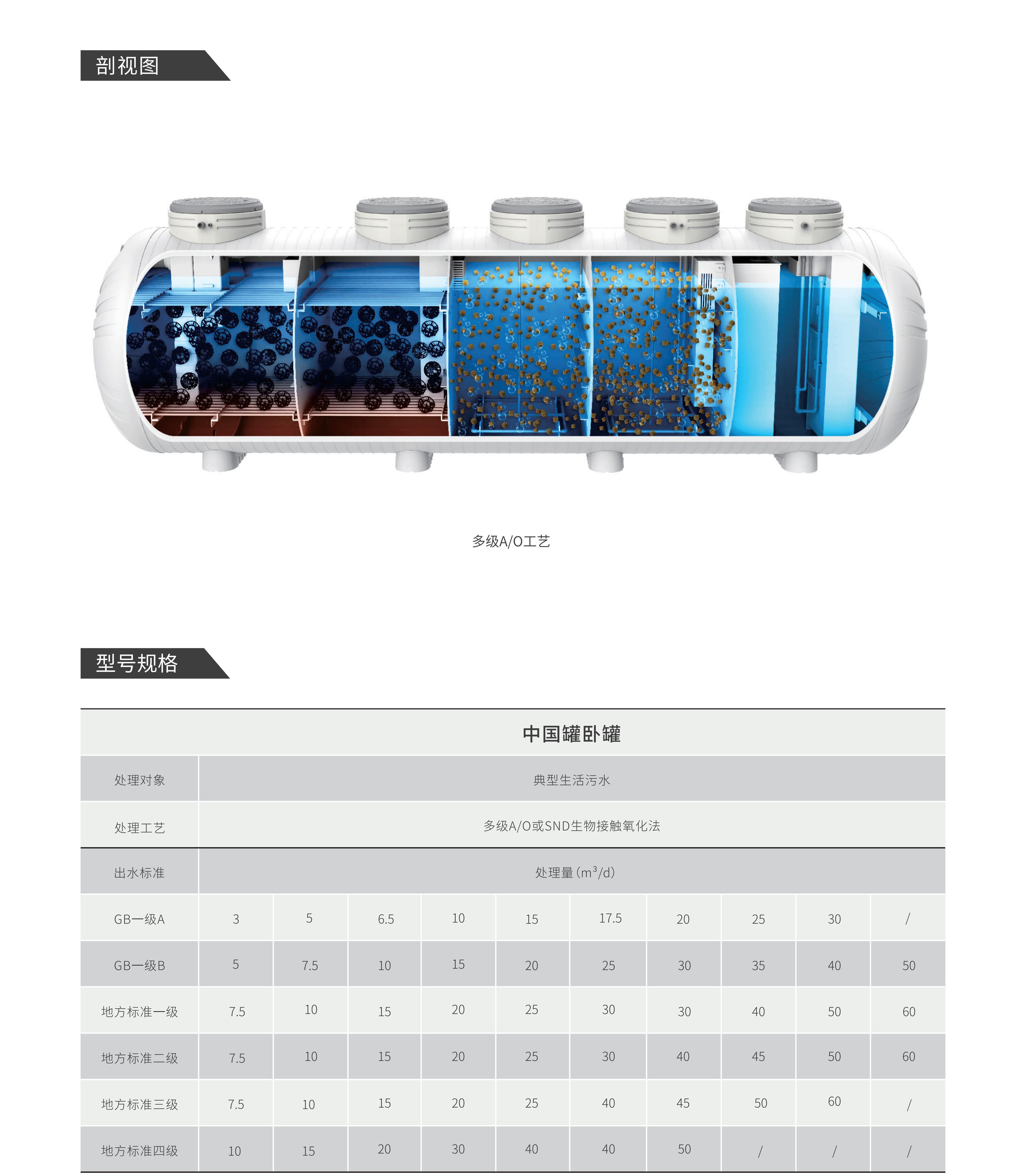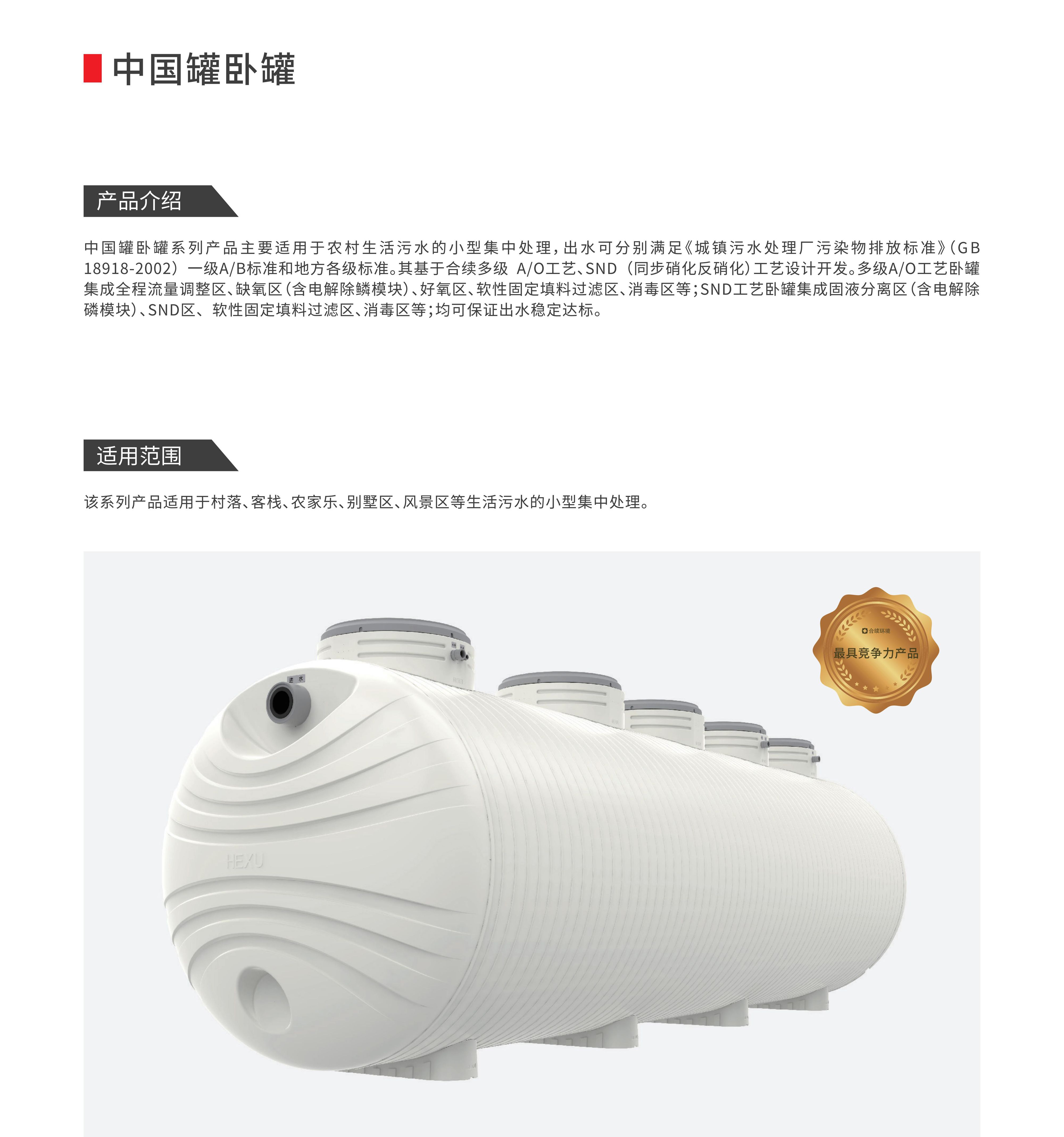 中國罐臥罐系列產品主要適用于農村生活污水的小型集中處理,出水可分別滿足《 城鎮污水處理廠污染物排放標準》(GB18918-2002)一級A/B標準和地方各級標準。其基于合續多級 A/O工藝、SND(同步硝化反硝化)工藝設計開發。多級A/O工藝臥罐集成全程流量調整區、缺氧區(含電解除鱗模塊)、好氧區、軟性固定填料過濾區、消毒區等;SND工藝臥罐集成固液分離區(含電解除磷模塊)、SND區、軟性固定填料過濾區、消毒區等;均可保證出水穩定達標。